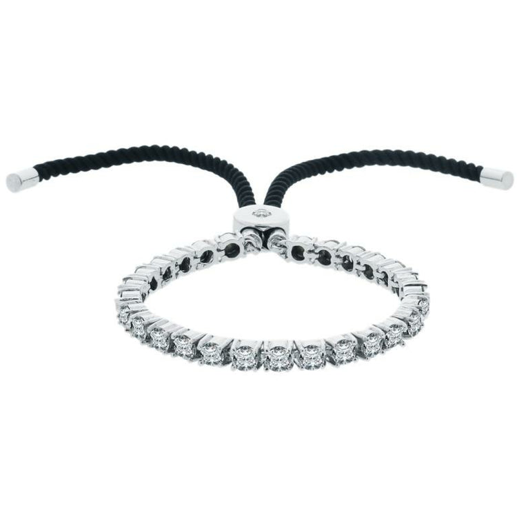 A stunning bracelet packed with no less than 27 Crystals from Swarovski. This is a dazzling bracelet with a contemporary twist as the black cord adds an intriguing mix of materials. The design of this piece means it will compliment a myriad of different outfits.