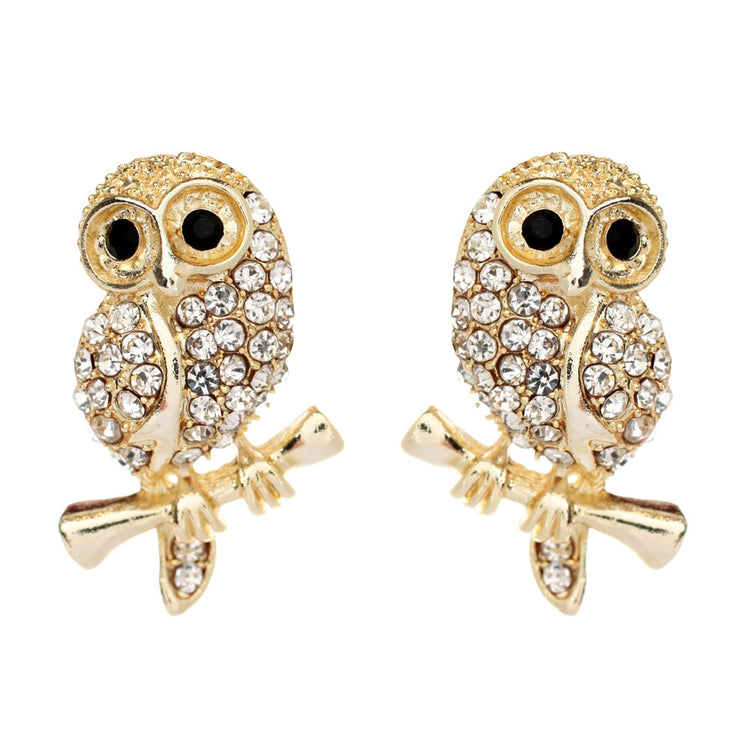 Gold-tone brass/ Silver-tone brass small owl studs with black resin eyes and Austrian crystals detailing. Closure: Post. Measurements: Length 1" x Width 0.5"