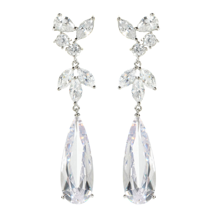 Silver plated unique royal earrings with Cubic Zirconia. Closure: Post. Measurements: Length 2.25" x Width 0.5"