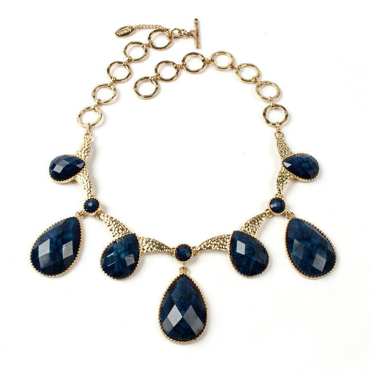 Teardrop necklace with resin stones and hammered finish. Measurements: Length 12"-16.75" adjustable x Width 2"