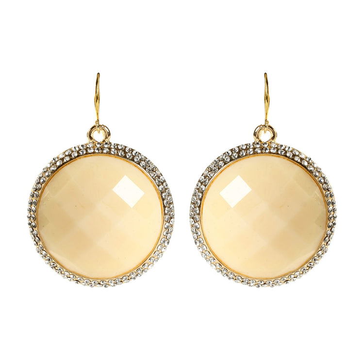 Gold-tone brass round earrings enhanced with Austrian crystal borders and backed by gold toned brass. Measurements: Length 1.5" x Width 1.5"