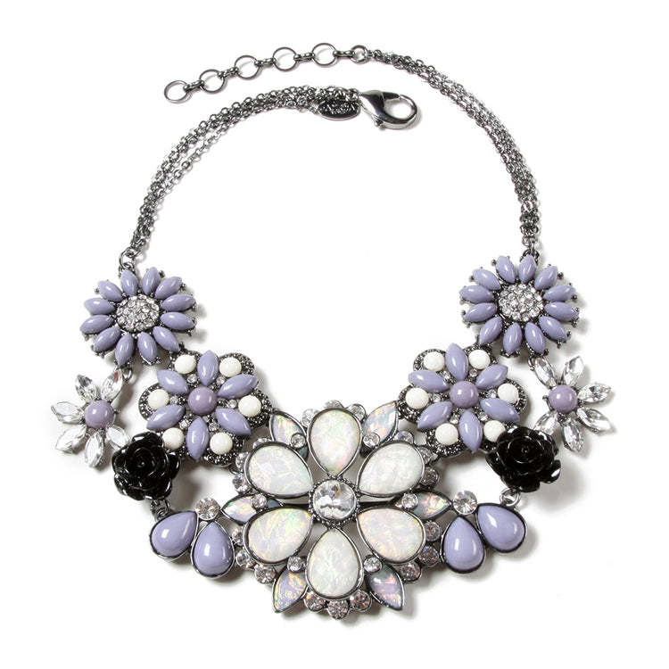 Flower necklace with Austrian crystals and resin stones. Measurements: Length 13.5"-15.75" adjustable, Bib: Length 6" x Width 2.5"