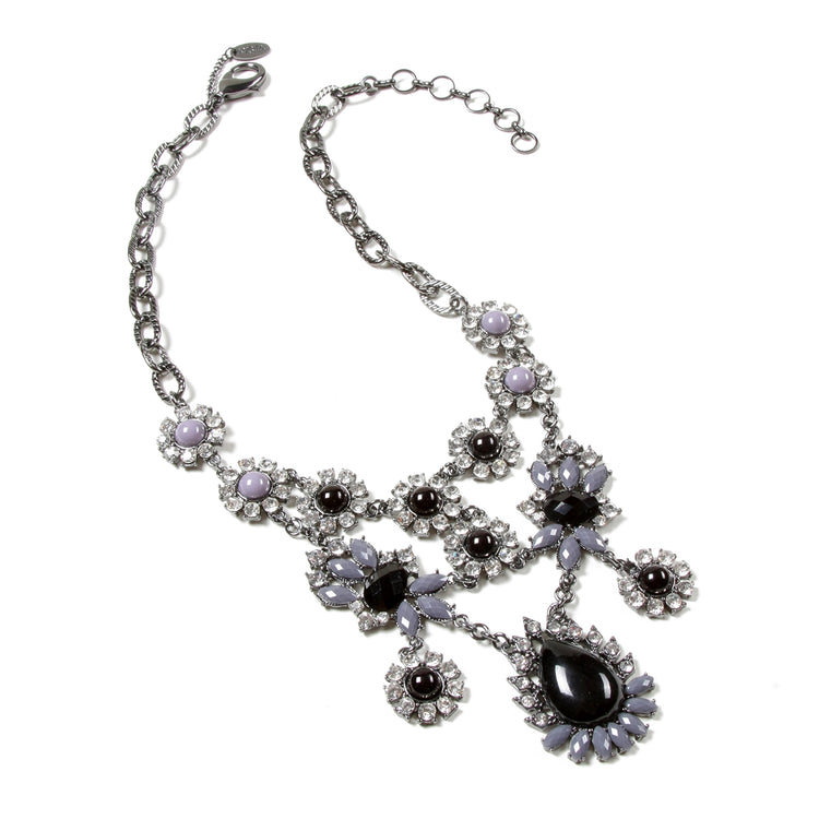 Find out why everyone is talking about colorful gunmetal necklaces infused with crystals by wearing the Leah Necklace! Flower detailing and a color combination to swoon for make this necklace irresistible. Gunmetal plated statement necklace with Austrian crystal and resin flower detailing. Measurements: Length 16.75"-18" adjustable; Drop: 4"