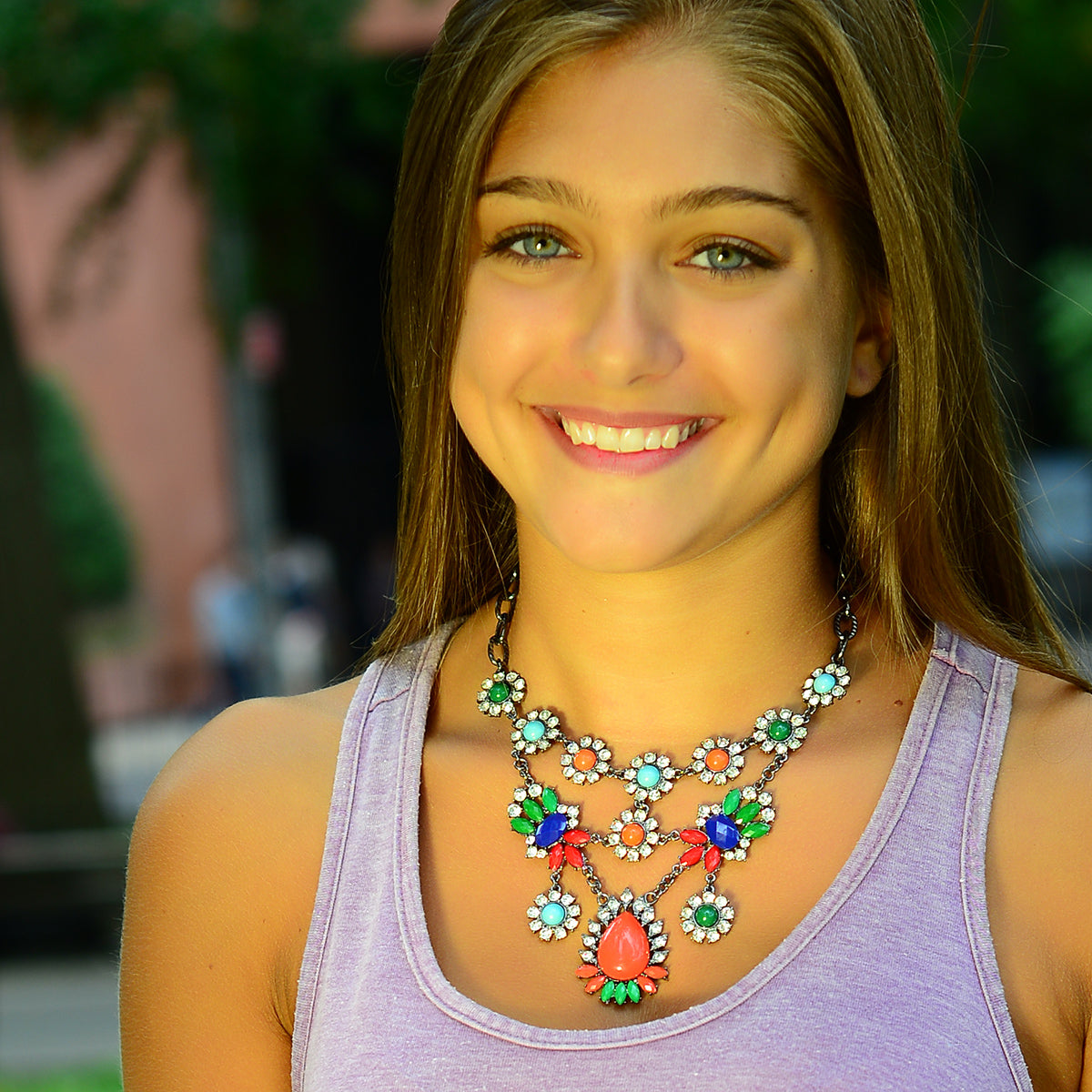 Find out why everyone is talking about colorful gunmetal necklaces infused with crystals by wearing the Leah Necklace! Flower detailing and a color combination to swoon for make this necklace irresistible. Gunmetal plated statement necklace with Austrian crystal and resin flower detailing. Measurements: Length 16.75"-18" adjustable; Drop: 4"