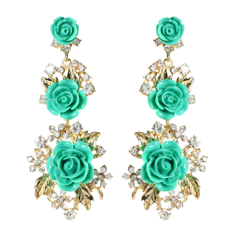Rose earrings with Austrian crystals and resin stones. Closure: Post. Measurements: Length 3.125" x Width 1.25"