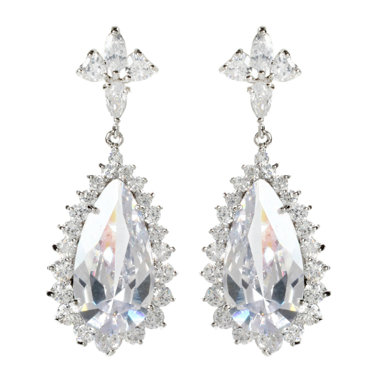 Silver plated gorgeous royal earrings with Cubic Zirconia. Closure: Post. Measurements: Length 1.75" x Width 0.5"