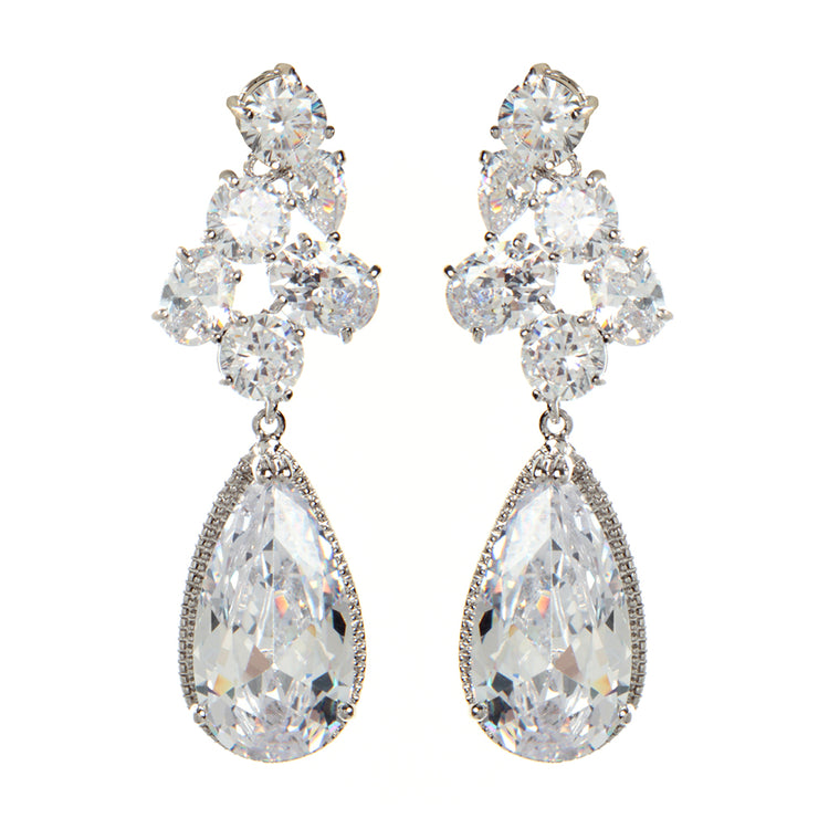 Silver tone brass earrings with Cubic Zirconia. Closure: Post. Measurements: Length: 1.8" x Width: 0.5" widest part of drop.