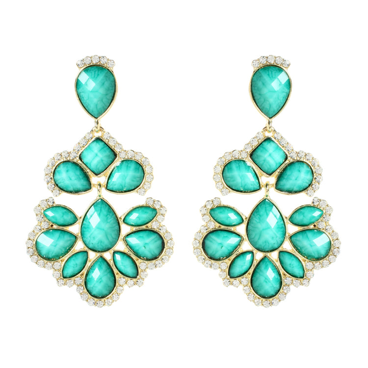 Iconic faceted earring with tear-shaped resin stones and surrounding Austrian crystals. Closure: Post. Measurements: Length 3.75" x Width 1.75"