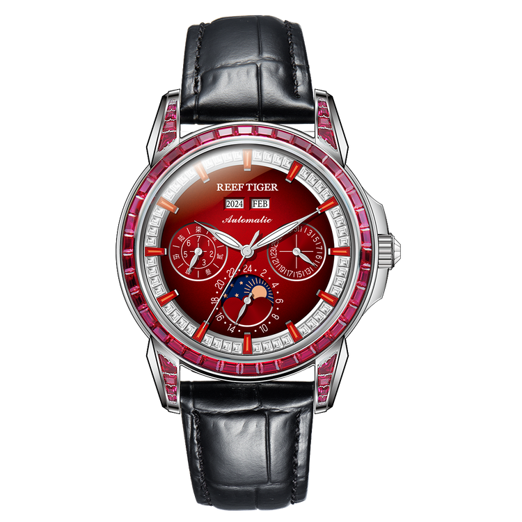 Reef Tiger Classic Philosopher Zirconia Bezel Multifunctional Mechanical Moon Phase Automatic Watch Burgandy RGA1988