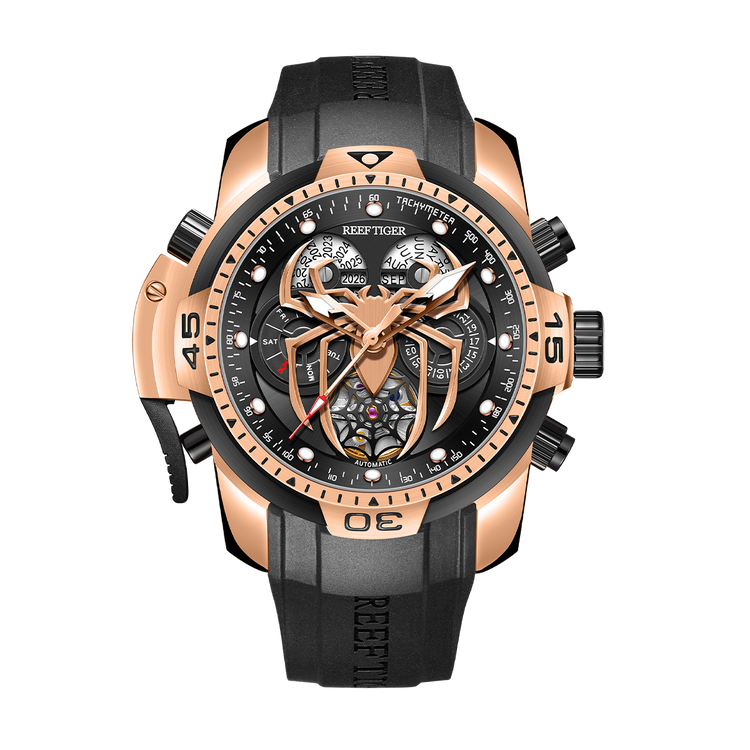 In conclusion, the Luxury Men's Sport Automatic Rose Gold Watch from Reef Tiger, the Aurora Spider, is a testament to the brand's commitment to producing high-quality timepieces that marry style with functionality. With its striking design elements and premium features, this watch is sure to appeal to discerning individuals who appreciate fine craftsmanship and attention to detail.