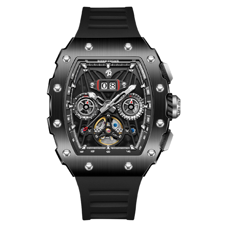 Reef Tiger Men's Aurora Titan Mechanical Multifunctional Day/Date Skeleton Automatic Watch RGA3009 Black