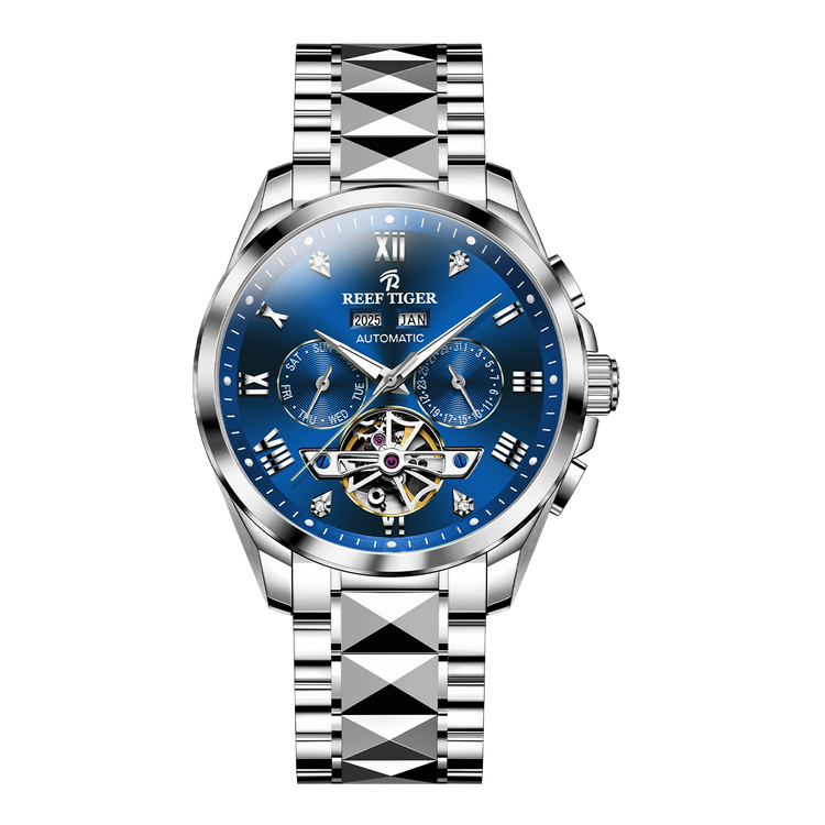 REEF TIGER: Classic - Constant Motion Series Model Number: RGA8235-YLY Dial Design: Blue Dial, Watch face is designed with year, month, date, day, luminous hands display & tourbillon style dial.…