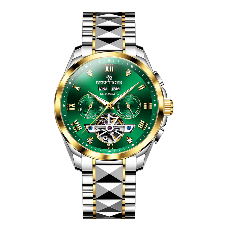 REEF TIGER: Classic - Constant Motion Series Model Number: RGA8235-PVY Dial Design: Green Dial, Watch face is designed with year, month, date, day, luminous hands display & tourbillon style dial.…
