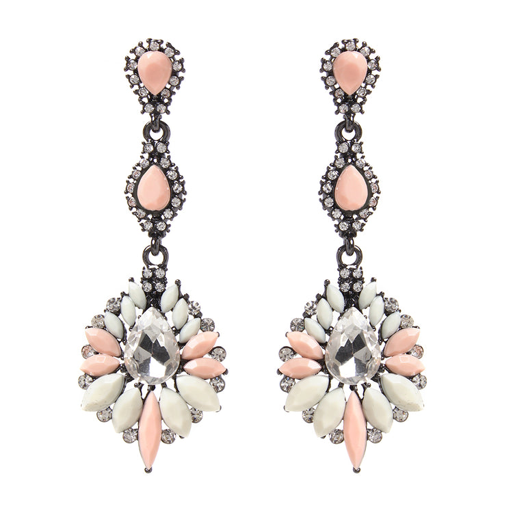 Gunmetal-tone brass earrings with Austrian Crystals, resin stones. Closure: Post. Measurements: Length: 3"; Large Drop: Length 1.5" x Width 1"