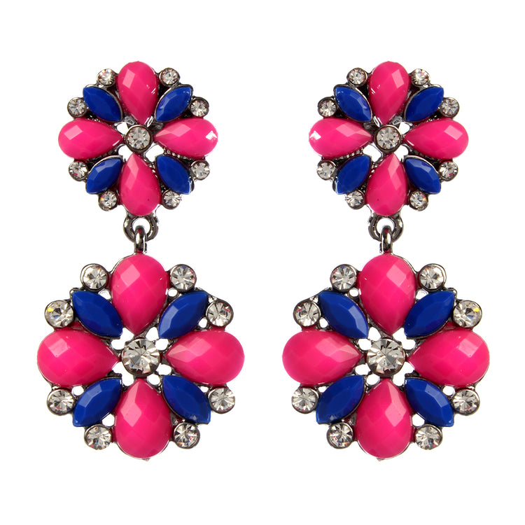 Two-tone flower earrings with Austrian crystals and resin stones. Closure: Post. Measurements: Length 1.875"x WIdth 1"