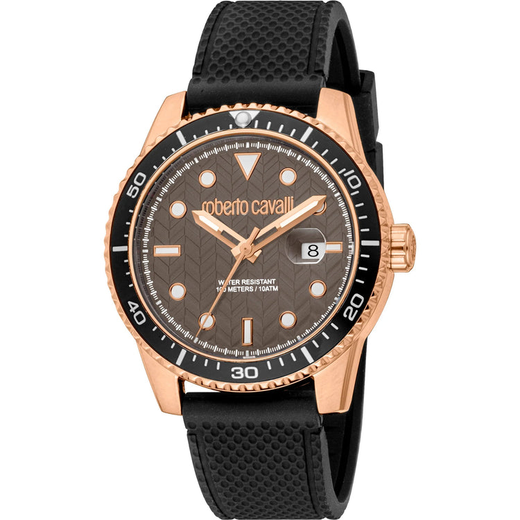A bold statement in rose gold, this men’s fashion watch captivates with its 42mm round case and mouse grey dial. The black silicon strap offers modern comfort, while water resistance…