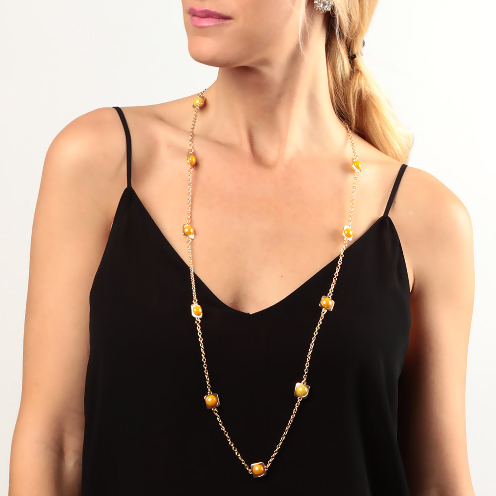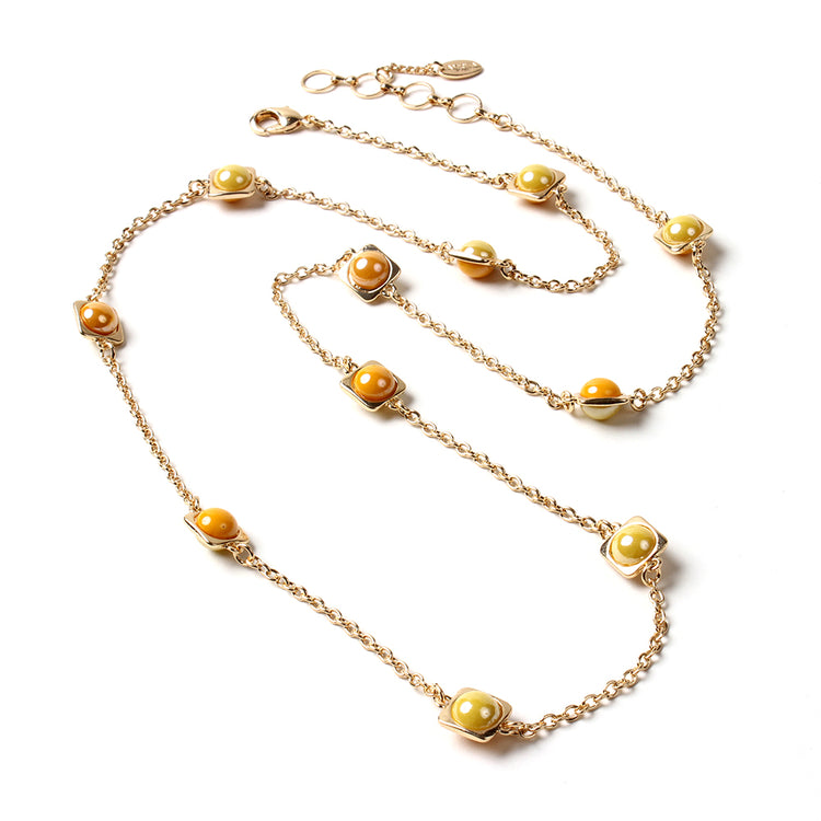 Gold-tone brass station necklace with resin beads. Measurements: Length 36"-38" adjustable; lobster closure