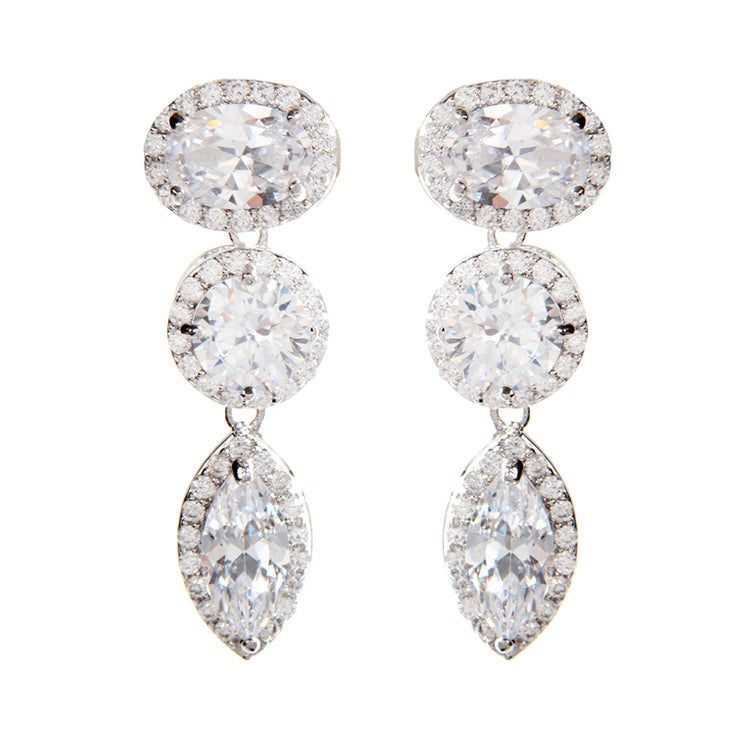 Silver tone brass earrings with Cubic Zirconia. Closure: Post. Measurements: Length: 1.6" x Width: 0.4" (center stone)